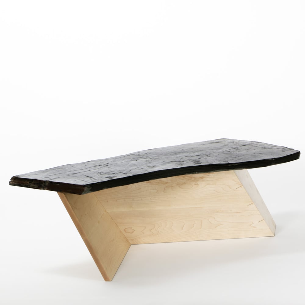The slate top is left unprocessed, in it's original shape as quarried from the hillside, with a tung oil finish applied. The base references geological formation and surfaces created in the hill side quarries of Willunga.