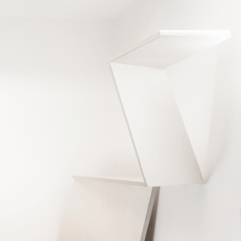A single surface wraps from a desk surface to form an upper shelf that springs off the wall. This creates a tranquil and weightless sense to create the perfect work environment. The unique design is achieved with complex compound angles and skilled craftsmanship.